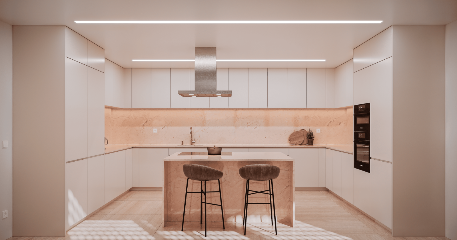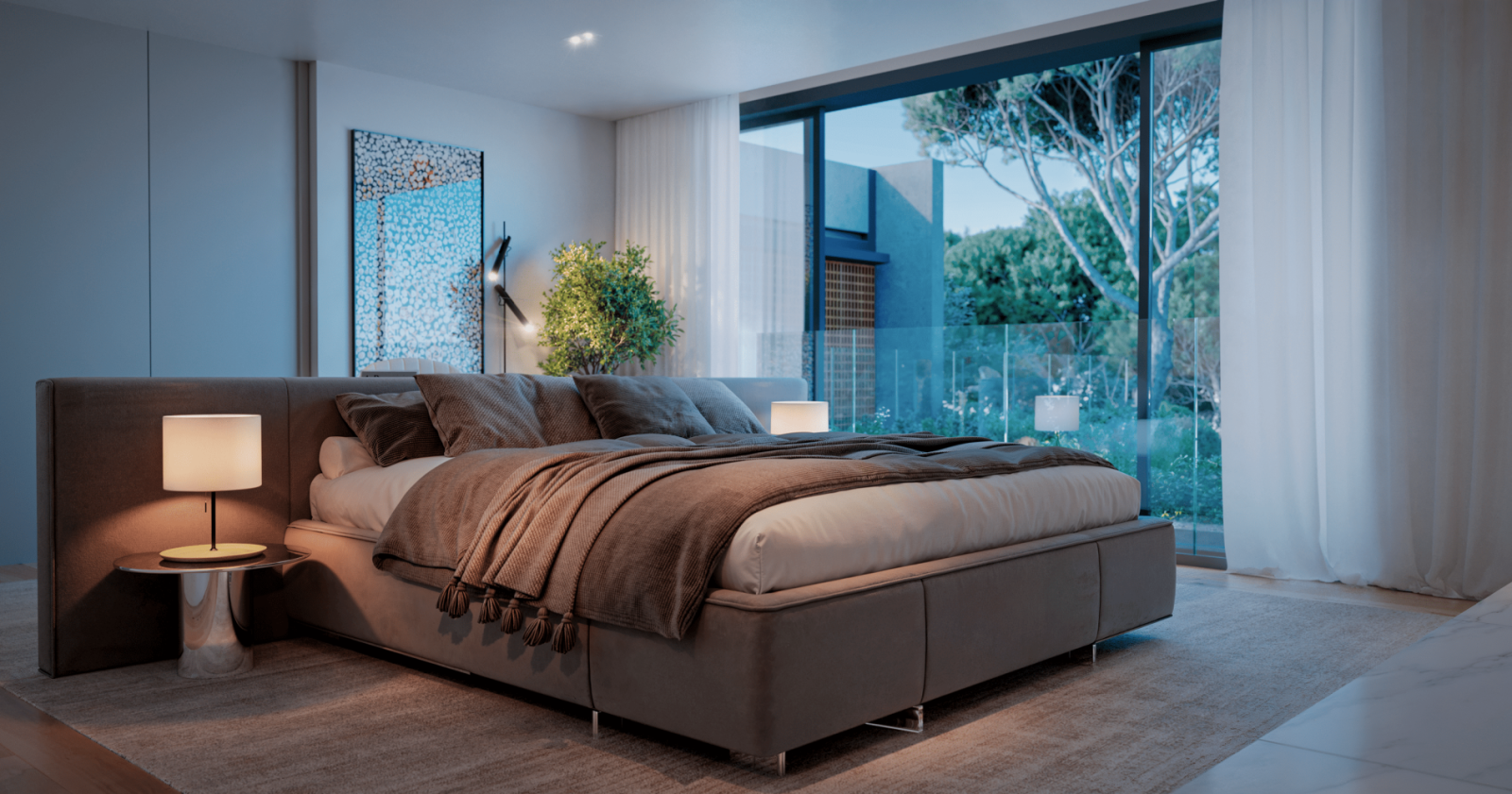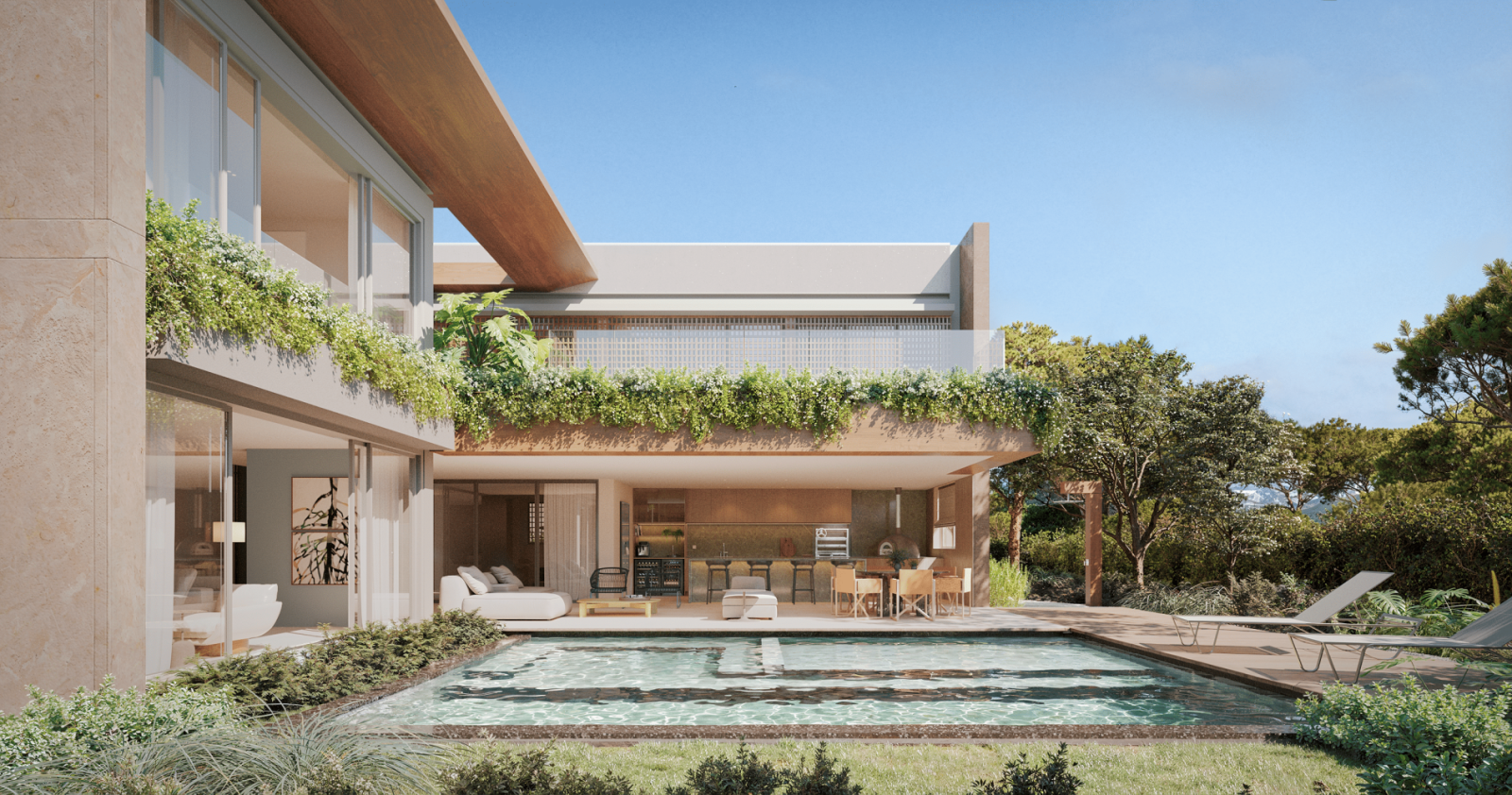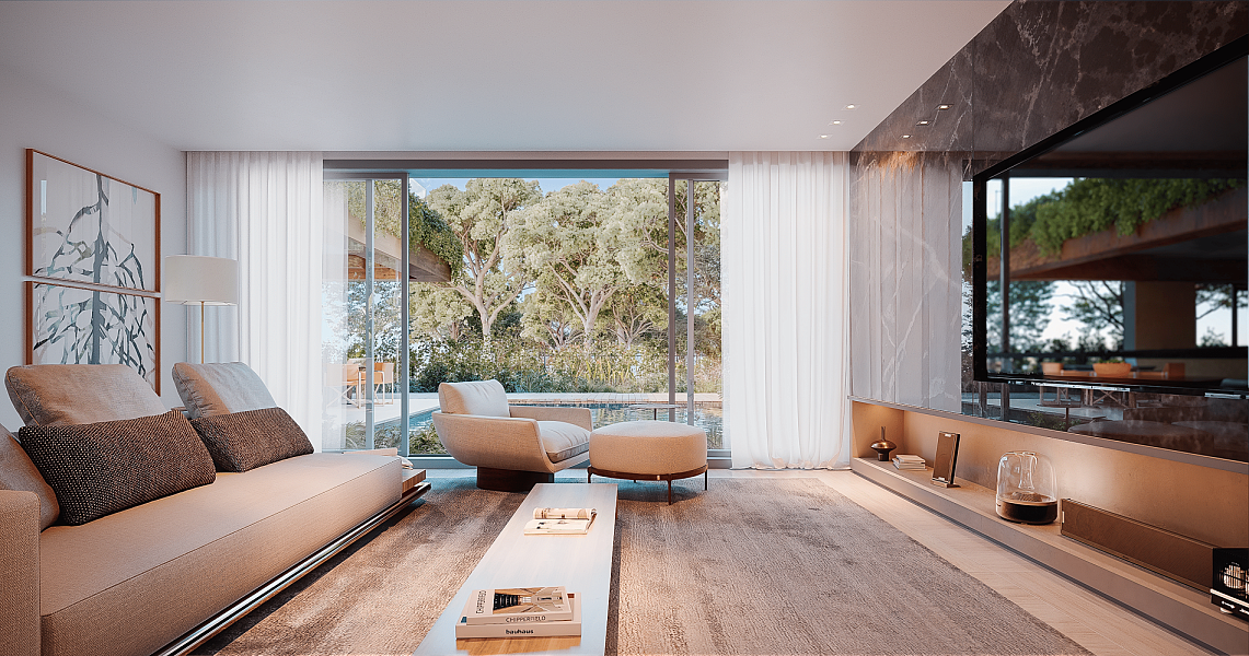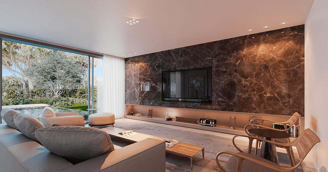 With over 700 m² of private gross area and generous gardens of over 400 m², each villa is a contemporary retreat where the integration between interior and exterior defines the space. The double-height social areas, private elevator, spa, gym, office or home lounge, and garage for four cars with electric charging reflect comfort, functionality, and sophistication.
